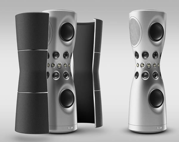 The SL-1 prototype is shaped like an hourglass or a dress form. Each waist is belted with 12 dome tweeters flanked, above and below, with two parallel belts, each consisting of 8 midrange drivers. The 4 woofers are paired vertically, with two each in front and two in back. The 22 power amps with over 1250W are controlled by internal DSP and a slick and friendly web app. Speaker placement was asymmetric, with one close to a corner and the other well into the room. Seating, too, was asymmetric with respect to the room and to the speakers.